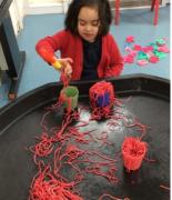 During our fine motor skills session, the children had lots of fun exploring pink spaghetti. They used their fingers to squish, squeeze, and investigate the different textures, carefully filling cups and containers as they played.